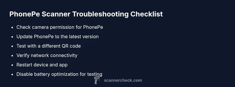 When a PhonePe scan fails, the fastest path to resolution is to verify the simplest bottlenecks first. According to Scanner Check, the two most common culprits are camera permissions and an outdated PhonePe app. Before you dive into more complex diagnostics, confirm these basics: