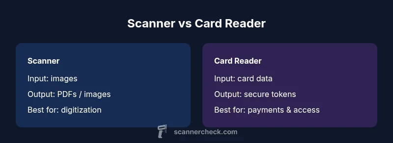 According to Scanner Check, the difference between a scanner and a card reader is not just hardware but the entire workflow they enable. A scanner is designed to capture physical media — documents, photos, index cards — and convert them into accessible digital formats. A card reader, by contrast, is built to authenticate or authorize actions by reading data from a card, such as a payment card, employee badge, or access credential. In real-world terms, you use a scanner when you need a digital copy of a document; you use a card reader when you need to verify identity or process a transaction. Understanding this distinction helps prevent overstretching a device beyond its intended job and ensures smoother integration with your software stack.