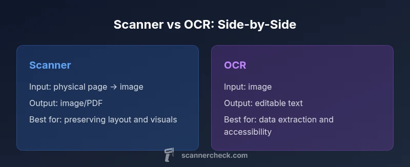 The phrase difference between scanner and OCR is often misunderstood by new buyers and even some seasoned professionals. A scanner sits in the hardware layer, responsible for converting physical pages into digital images. OCR, short for optical character recognition, lives in the software layer and analyzes those images to identify letters, words, and layout, turning them into editable, searchable text. In many modern workflows, these steps are combined: you feed a physical document into a scanner, save the result as an image or PDF, and then run OCR to unlock text that can be indexed, edited, or analyzed. According to Scanner Check, clearly separating these roles helps you design robust pipelines rather than cobbling together tools that don’t communicate well. As a result, you can set expectations for accuracy, speed, and downstream workflows from the outset, reducing surprises during deployment.
