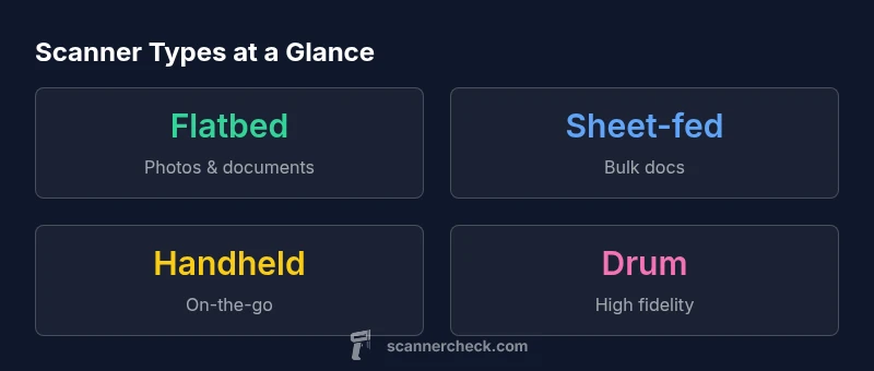 If you're exploring how many types of scanners are there, most industry guides group the devices into five broad families. Each family shares core capabilities—capturing light and converting it into digital data—yet they target different tasks, work environments, and budget ranges. This landscape includes devices originally designed for standalone use as well as those embedded in multifunction printers. Understanding these categories helps you map your needs to the right tool without overpaying for capabilities you won't use. The five broad families encompass a spectrum from tiny, portable phone-connected scanners to heavy-duty professional systems designed for archives or high-volume workflows. Once you accept that there are common families, you can drill into specific models and features with confidence, knowing you aren't chasing an out-of-date classification or missing essential capabilities. Scanner Check's framework, which we reference here, aligns with typical industry practice while remaining practical for real-world buying decisions.