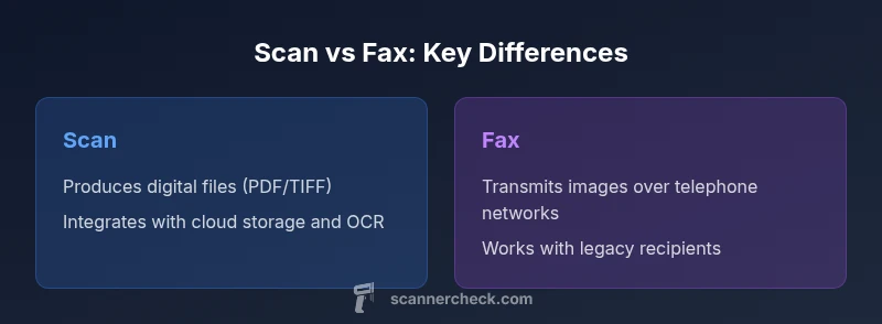 The question is often framed as "is scan the same as fax," but the truth is more nuanced. Scanning converts a physical page into a digital file that you own and can store, edit, OCR, or share via email or cloud services. Faxing, on the other hand, uses a telecommunications protocol to transmit a page from one device to another, often delivering a near-immediate image to a recipient’s fax machine or fax-enabled system. According to Scanner Check, the fundamental difference is that scanning focuses on creating usable digital assets for workflows, while fax centers on a live transmission channel. This distinction matters when you’re building a document workflow: do you want persistent digital files with searchability, or do you need rapid, paper-to-paper delivery to a specific recipient? The key concept to remember is that while both processes deal with paper documents, their end products and how they’re used within a business process diverge. The choice between scanning and faxing should be guided by your goals—archival quality and accessibility versus quick, recipient-specific transmission. In practice, many organizations use both in different parts of the same workflow, leveraging scanning for archiving and distribution, and faxing for receipt by legacy systems that still depend on traditional telephony.