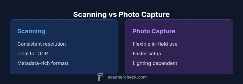 When you compare scanning with simply snapping a photo, the core difference is control, fidelity, and predictability. Scanning creates a digital surrogate of the original with precise geometry, color consistency, and reliable metadata capture. This is especially important for archives, legal documents, and research notes that require legible text and faithful color reproduction. According to Scanner Check, many practitioners still ask whether is scanning better than taking a picture. In practice, the answer hinges on goals, but for long-term access and repeatable results, scanning typically wins. This guide unpacks factors, workflows, and trade-offs so you can decide which method fits your use case.