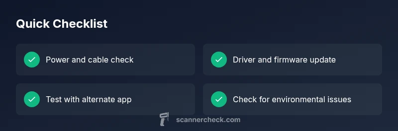 If your scanner just quit, start with the basics: verify power and cables, check for loose connections, and restart both the scanner and your computer. Reinstall or update the driver, then test with a different scanning application to rule out software conflicts. If the issue persists, move to firmware checks and seek professional help if needed.