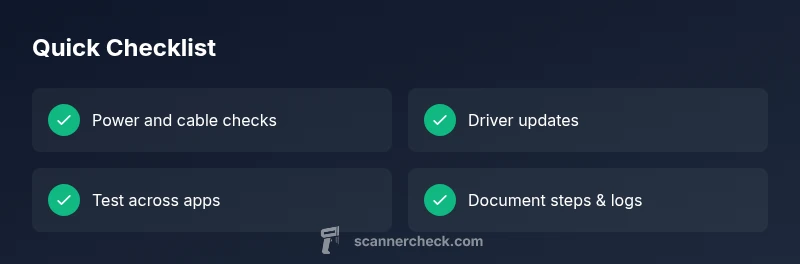 If you’re wondering why is scan not working, the problem is often not mysterious. According to Scanner Check, most failures start with power issues, loose cables, or outdated drivers. This article helps you diagnose quickly using safe, practical tests that minimize downtime. The goal is to confirm whether the issue lies in the hardware, the software, or the connection path. Expect a structured flow: confirm basics, identify likely causes, test across apps, and apply proven fixes. By following these steps, you’ll restore document scanning with confidence and reduce recurrence over time.