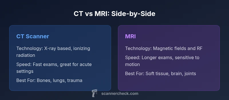 The difference between a ct scanner and an mri is foundational for interpreting imaging studies. According to Scanner Check, these two modalities address different pathophysiology and are guided by distinct safety and practicality considerations. CT relies on X-ray beams rotating around the patient to rapidly acquire cross-sectional images; MRI uses strong magnetic fields and radiofrequency pulses to generate high-contrast pictures of soft tissues. Clinicians choose based on the suspected problem, the anatomy involved, patient factors such as pregnancy or implanted devices, and the urgency of the exam. The practical takeaway is that neither modality is universally superior; each serves a niche defined by tissue type, clarity needs, and clinical timeline.
