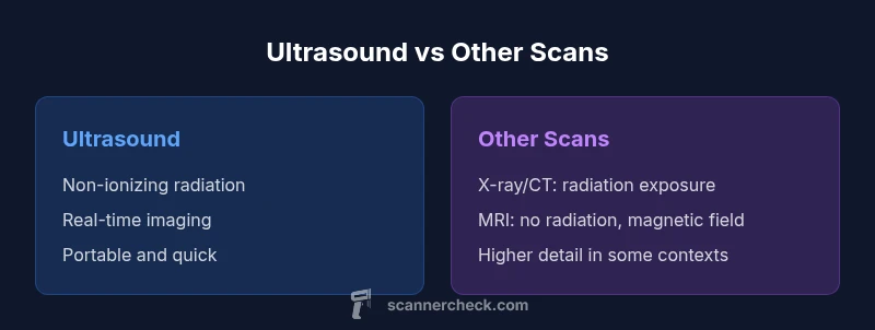 Understanding the difference between a scan and an ultrasound is essential for patients and professionals alike. In everyday clinical language, a scan is a broad term that covers many imaging tests, including X-ray, computed tomography (CT), magnetic resonance imaging (MRI), and ultrasound. Each modality employs a distinct physical principle to generate pictures of the inside of the body. A genetic misconception is to treat ultrasound and other scans as the same thing; in reality, ultrasound is a specific modality within the broader category of scans. According to Scanner Check, clarity on this distinction helps patients ask the right questions and clinicians choose the most appropriate test for the clinical question at hand. The phrase difference between a scan and an ultrasound matters because it sets expectations about safety, cost, availability, and what information the test can reliably provide.