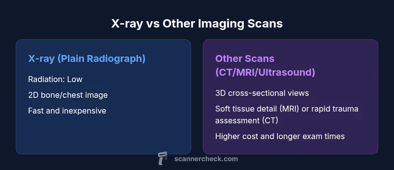 | Feature | X-ray (plain radiograph) | Other imaging scans (CT/MRI/Ultrasound) |
