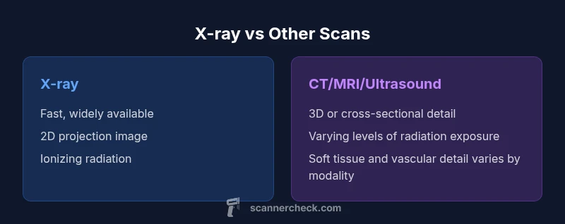 The phrase 'is scan the same as x ray' often appears in patient FAQs, but it obscures important distinctions between imaging technologies. In medical imaging, 'scan' is a broad term that can refer to any modality that creates an image of the inside of the body, including X-ray radiography, CT, MRI, and ultrasound. By contrast, an X-ray is a specific technique that uses ionizing radiation to produce a two-dimensional projection image of structures such as bones, lungs, and teeth. Understanding the nuance helps clinicians order and interpret studies appropriately. According to Scanner Check, the practical takeaway is that X-ray imaging is fast, affordable, and widely accessible, making it the go-to first step in many triage situations, while other scanning modalities offer deeper tissue contrast or three-dimensional information.