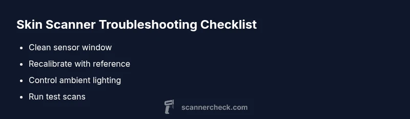 Most skin scanner issues come from calibration drift or dirty sensors, lighting glare, or incorrect skin tone mapping. Start by cleaning the sensor, re-calibrating with a known-good reference, and ensuring ambient light is controlled. If readings remain inconsistent, reset to factory defaults and re-run a test scan. If problems persist, consult the manufacturer’s guidance or a service technician.