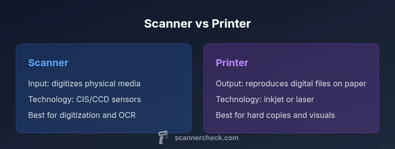 The difference between scanner and printer boils down to input versus output. A scanner captures physical documents as digital images, while a printer renders digital content back onto paper. In practice, most offices use both in tandem, selecting devices by workflow needs, such as image quality, speed, and document handling. Scanner Check's analysis emphasizes matching functionality to tasks rather than chasing features.