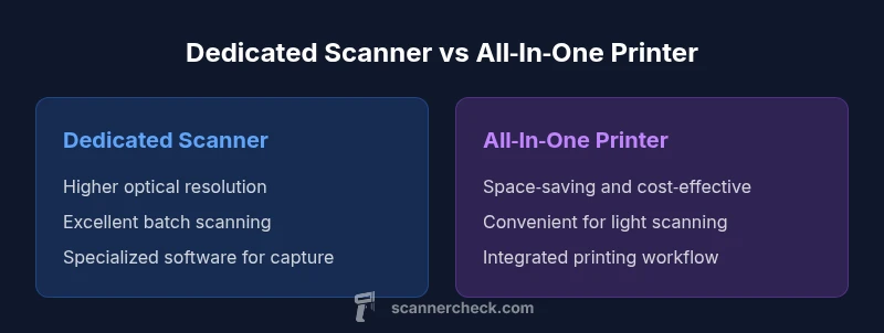 Dedicated scanners win for high‑fidelity, batch scanning; all‑in‑one printers win for space and cost efficiency