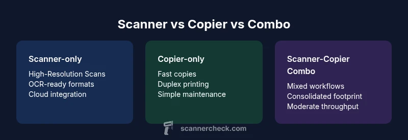 A scanner and a copier describe two core document-handling functions that often appear together in modern devices. A scanner uses imaging sensors to capture the physical page and convert it into a digital file; typical outputs include PDF, TIFF, and JPEG. A copier, by contrast, takes digital input or a scanned image and reproduces a hard copy on paper. When a device combines both functions, users gain a flexible, space-saving solution for office work, home offices, or classrooms. The distinction matters for workflow design: if your priority is digital archiving, you want a capable scanner; if you frequently produce paper copies, you need reliable copying performance; if your environment demands both tasks, a scanner-copier combo can simplify procurement and maintenance. According to Scanner Check, the best practice is to map your average document volume, preferred output formats, and integration with cloud services before choosing a model. In real-world use, many teams start with a basic scanner and expand to a copier later, or opt for a combo unit to avoid device sprawl. 2026 is a good baseline year to evaluate new models and software ecosystems.