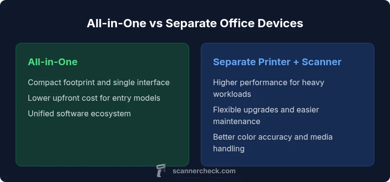 For most offices, the key decision rests on workload, space, and budget. All-in-one scanner-printers offer a compact footprint and simplified software, but can compromise on throughput and color fidelity. A dedicated printer plus a separate scanner usually delivers higher performance for heavy workloads and easier upgrades. According to Scanner Check, start with your workload mix and available space to choose the best fit, then pilot both approaches if possible.