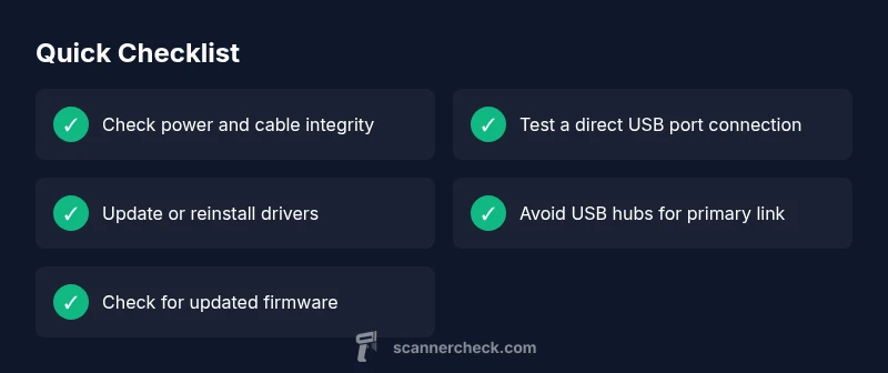 Before diving into driver reinstallation, run through a quick triage checklist that catches the majority of cases. Start by ensuring the scanner is powered on and that the power light is steady. Reseat the USB cable at both ends and try a different USB port on the computer, preferably a direct port rather than a hub. If you have another computer available, connect the scanner there to determine whether the issue is device- or computer-related. Check the control panel or scanner software to confirm the correct scanner is selected as the default input device. Temporarily disable antivirus or security software if safe to do so, then recheck connectivity. If the scanner shows up but fails to communicate, note any error codes or messages; these typically point to the next step. After these steps, you should have a clearer path forward.