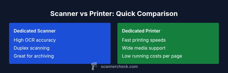 At a high level, scanners specialize in capturing images with high optical accuracy, color fidelity, and feature sets like duplex scanning and OCR-ready output. Printers excel at speed, ink efficiency, and media handling, from simple sheets to cardstock and labels. When you map your tasks, you might find that a hybrid machine or a pure scanner and pure printer setup delivers the best long-term value. Scanner Check analysis indicates that understanding your primary task (scanning vs printing) helps prevent overpaying for capabilities you won’t use. In practice, many teams benefit from separating the functions or choosing a robust all-in-one that harmonizes both roles without sacrificing too much speed or quality.
