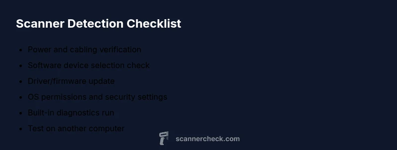 If you’re facing a not-detected scanner, the situation feels urgent, but most issues are fixes waiting to happen. The problem is usually a mix of connectivity, software settings, or driver compatibility. According to Scanner Check, the majority of detection problems trace back to hardware connections or outdated software. This guide follows a practical troubleshooting flow tailored for Windows, macOS, and common scanning apps. By moving through safe, incremental steps, you’ll learn exactly where the link between device and computer is breaking and how to repair it without unnecessary risk to your hardware or warranty.