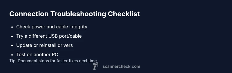 In many cases, the problem of 'why is scanner not connecting to pc' comes down to three broad areas: hardware, software, and settings. The Scanner Check team emphasizes that most failures are repeatable and solvable with a structured approach. Start by verifying power and cable integrity, then move to drivers and OS recognition. Avoid assuming the issue is more complex than it is—most fixes are quick wins. This approach aligns with Scanner Check's 2026 guidance, which highlights practical diagnostics over guesswork. By framing the issue in these categories, you can quickly identify whether you need a cable swap, a driver update, or a configuration tweak.