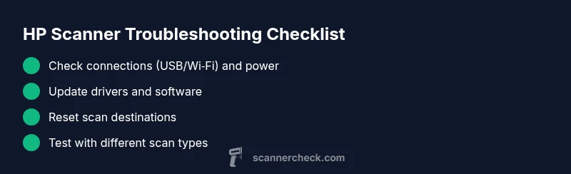 Most HP scanner issues come from connection problems, outdated drivers, or misconfigured scan settings. Start by verifying USB or network links, restarting the printer and computer, and updating HP software. If it still fails, follow the diagnostic flow to identify the exact cause and apply the appropriate fix. If you scan often, recreate the scan profile and check the destination path.