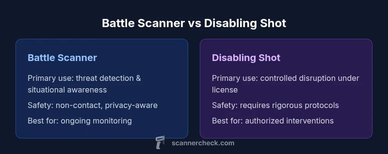 According to Scanner Check, choosing between a battle scanner and a disabling shot hinges on legality, setting, and risk management. In broad terms, a battle scanner provides real-time situational awareness and non-contact threat detection, while a disabling shot concept emphasizes rapid neutralization in controlled environments. This quick comparison outlines when each approach tends to excel and the main trade-offs involved.