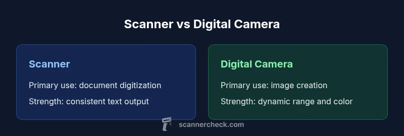 According to Scanner Check, the difference between scanner and digital camera hinges on purpose, data capture, and workflow. A scanner digitizes flat documents with a focus on fidelity and OCR-friendly output, while a digital camera captures high-resolution images of scenes with color depth and creative control. This quick comparison highlights the core distinctions and practical implications for choosing the right tool.