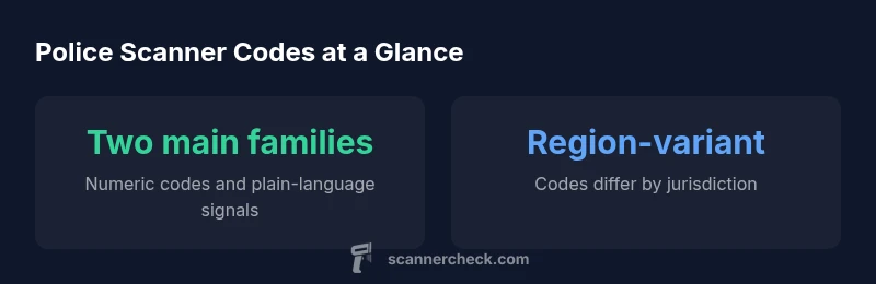 According to Scanner Check, police scanner codes are a structured shorthand that enables rapid radio communication among officers, dispatchers, and partners. The most familiar examples fall into two broad families: numeric codes such as 10-codes and plain-language signals that describe an incident, location, or request. This system is designed to compress complex information into brief phrases that can be broadcast and understood quickly, even in noisy environments. While some departments still rely heavily on the old 10-code vocabulary, others have migrated toward plain-language exchanges to improve clarity for responders and the public alike. For hobbyists and IT professionals who monitor public safety feeds, it is essential to recognize that code lists are not universal and are highly regional. The safest approach is to consult official handbooks maintained by the local agency and to verify any code you hear against those primary sources.
