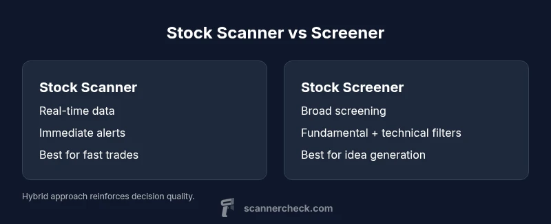 In trading, a stock scanner is a real-time filter that continuously watches price, volume, and other live sources to surface immediate opportunities. A stock screener, by contrast, applies predefined rules to a wide universe of stocks to produce a list of candidates for deeper review. The distinction matters because scanners are about speed and responsiveness, while screeners emphasize breadth and multi-factor filtering. For many traders, using both tools in a staged workflow yields the best results: scanners grab the fast trades, screeners identify longer-term ideas for further evaluation. According to Scanner Check, establishing a clear separation between these tools helps reduce decision fatigue and improves hit rates. To implement this, you might configure a high-signal scanner for intraday scans and pair it with a more conservative screener that screens on fundamentals and technicals across the market. In practice, the main difference is not the data type alone but how you interact with that data: real-time alerts vs batch-generated lists. By understanding this, you can tailor your dashboards, alerts, and watchlists to fit your trading style.