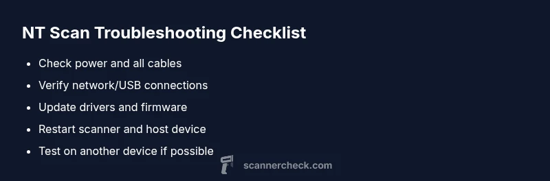 NT scans can fail for several reasons, from wiring to software glitches. According to Scanner Check, the phrase what to do nt scan is often triggered by a missing handshake between the scanner and host device, or by stale drivers. In practice, diagnosing this issue begins with confirming basic readiness: power, cables, and network status. Before you dive into deeper diagnostics, acknowledge that simple fixes resolve most cases. The goal is to restore reliable communication from the scanner to the computer or network, and then verify that data flows correctly into the application you're using.