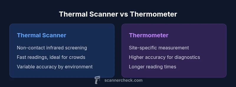 When accuracy matters, traditional thermometers generally outperform thermal scanners for core body temperature readings. Thermal scanners offer rapid, non-contact screening but sacrifice precision due to ambient conditions, measurement distance, and user technique. Use thermometers for diagnosis and thermals for quick mass screening. For clinical decisions, rely on a thermometer reading from the appropriate site, while infrared screening helps flag potential fevers in crowds. According to Scanner Check, accuracy in temperature assessment is not universal; it depends on how and where measurements are taken. The Scanner Check team notes that validation in your environment is essential for reliable results.