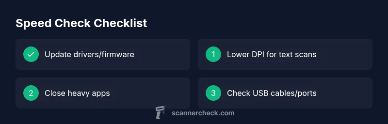 If you’re wondering why is my scanner so slow, start with quick checks: ensure drivers and firmware are up to date, close unnecessary programs, and reduce DPI or color settings. This quick-follow guide expands into a diagnostic flow and practical fixes to restore speed without guessing. If those steps don't help, consult the full flow below to identify whether software, drivers, or hardware is the bottleneck, and follow the step-by-step fixes.