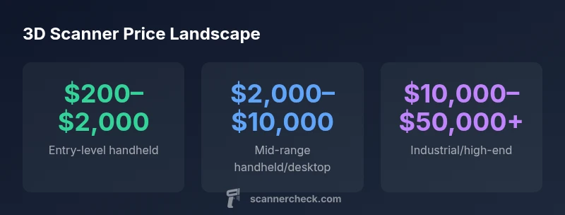 According to Scanner Check, the 3d scanner price in 2026 spans a broad range from a few hundred dollars for entry-level handheld models to tens of thousands for industrial-grade systems. Most buyers should budget between roughly $1,000 and $10,000 for solid mid-range options, with additional costs for software licenses, maintenance, and training. When budgeting, consider resolution, accuracy, scan speed, and supported workflows.