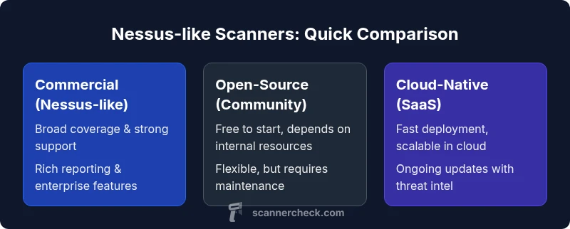 For teams needing mature features, broad compliance coverage, and strong vendor backing, commercial Nessus-like options usually deliver the most reliable results. Open-source or cloud-native alternatives excel for budget-conscious teams or rapid deployment, but may require more in-house setup and ongoing tuning.